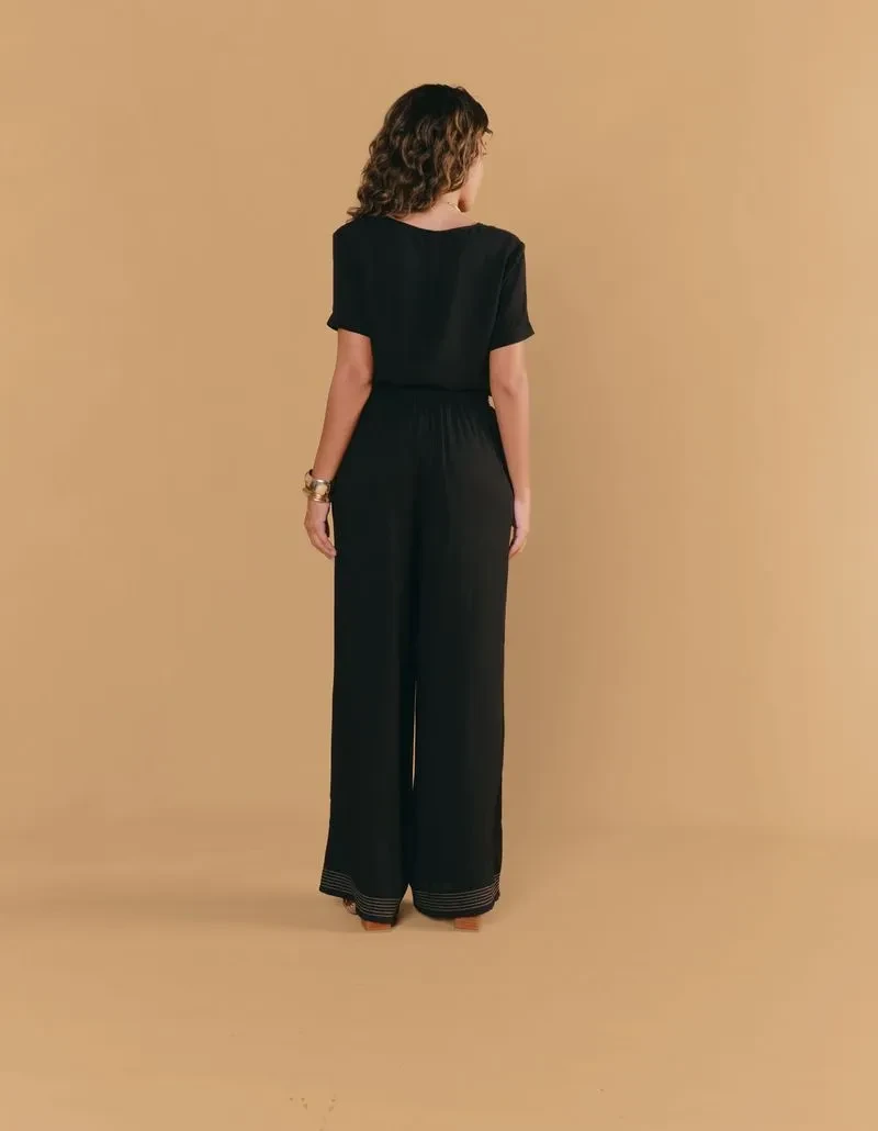 Calça Detalhe Pespontos é feita em 100% viscose, trazendo leveza, frescor e caimento impecável. A modelagem ampla garante conforto e movimento, enquanto os pespontos na barra e no cós adicionam um toque de charme e sofisticação ao visual. Ideal para quem busca praticidade com estilo.